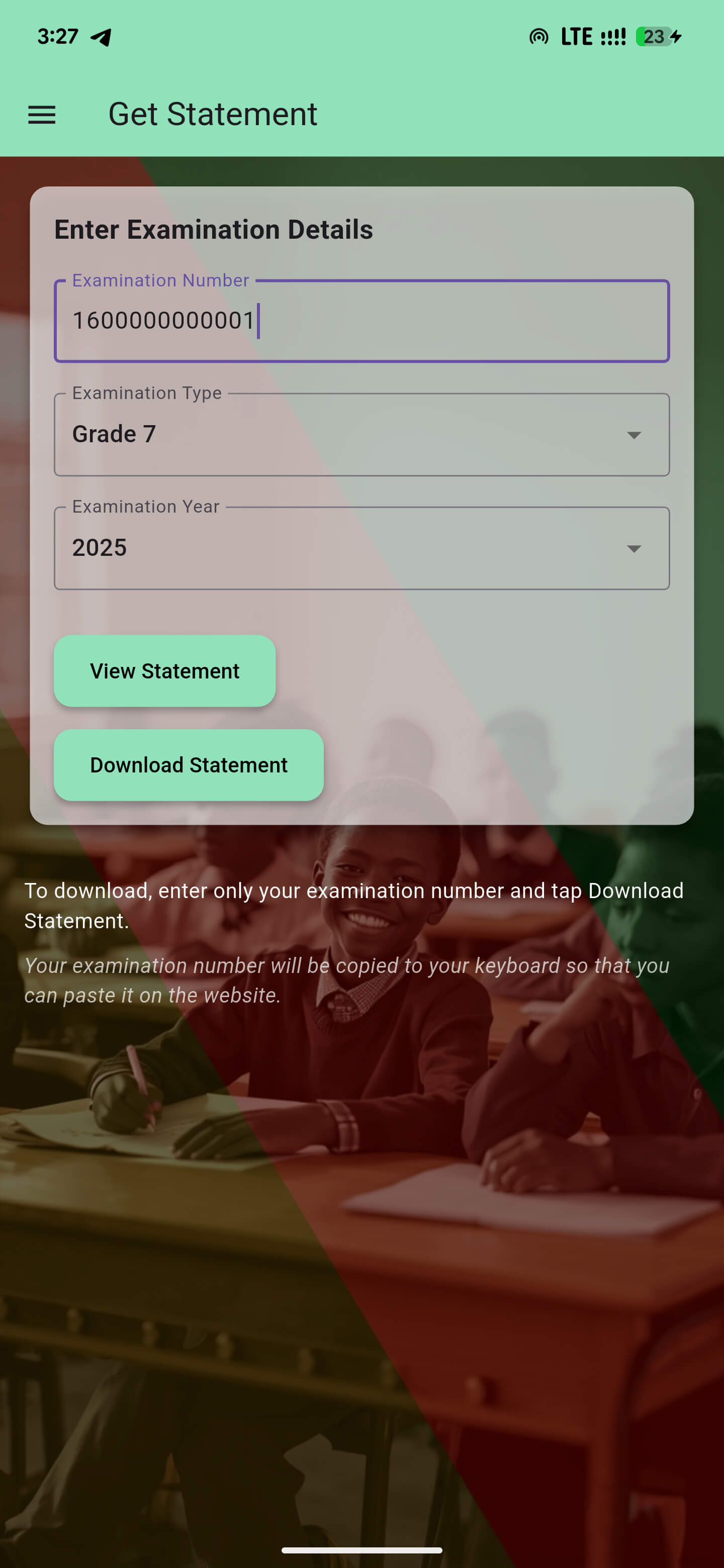 - Then click Download Statement, clicking the button copies your examination number to your clipboard.